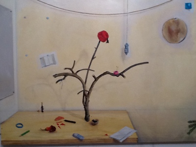 Sadly the Christmas tree we bought in a pot three years ago looks like Charlie browns Christmas tree. Sad. We should have repotted it and gave it some food. But we didn't. So we had to go and hunt a suitable replacement, here it is peeking in at the side. Its a little bit difficult to finish this bit of the painting because I'm not sure what else is going on in this part. We shall wait and see... Maybe a mother shelf/table maybe a cupboard, maybe a big hole to outdoors...
